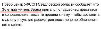 А вот сюжет, предлагает Евгения, как раз для Хичкока. Суровые уральские приставы не простили сурового трехлетнего ребенка, укравшего конфетку. Достали даже из холодильника. Разморозили в горячей воде - и в суд!