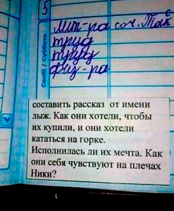 Вот такие задания дают нынче в школе, вздыхает Антон. Ну, хорошо хоть от имени лыж, а не от имени дров. Кстати, а как лыжи хотели, чтобы их купили? Прям сильно-сильно?!!