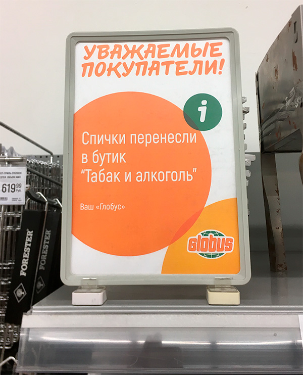 Александр подсказывает, где теперь можно купить спички. В бутике "Табак и алкоголь". А туалетную бумагу перенесли в изыск-салон "Все для стирки".