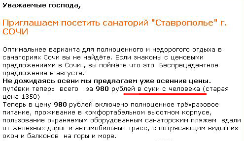 Не хотите в Турцию - тогда можно в Сочи, предлагает Александр. Там, правда, в объявлении опечаточка вкралась: