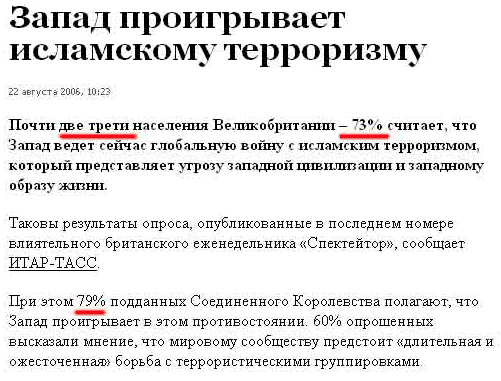 Конечно, 73% - это две трети. Они считают, что Запад ведет войну. 79% считают, что Запад проигрывает. То есть 6% считают, что Запад войну не ведет, но в ней уже конкретно проигрывает. Чисто деловой подход, тут не поспоришь. Факты - упрямая вещь!