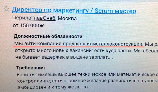 Директор по маркетингу, он же scrum-мастер, это прекрасно, я считаю. Хотя я когда-то видел водителя, он же генеральный директор, да.