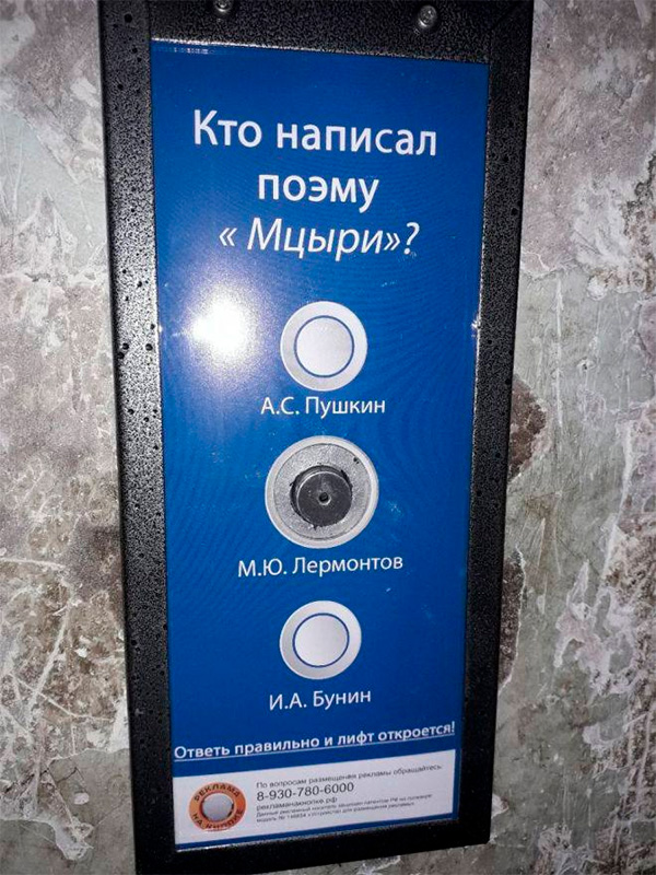 А кнопки дли лифта надо делать тач-педом. Чтобы вопросы и ответы менялись каждый день.