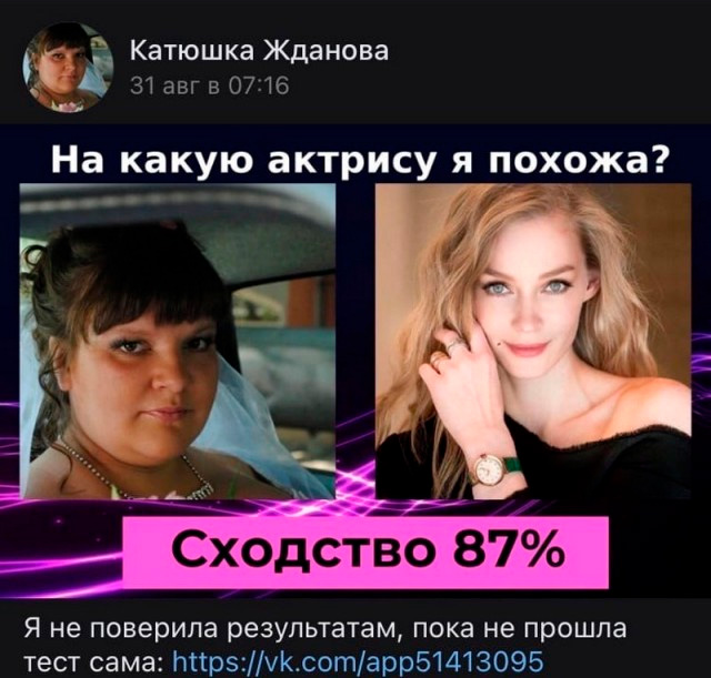 Девушки не на 87, а на 93 процента совпадают. Глаза два, уха два, носа... один. Как и рота. Собственно, вся разница в цвете и длине волос.