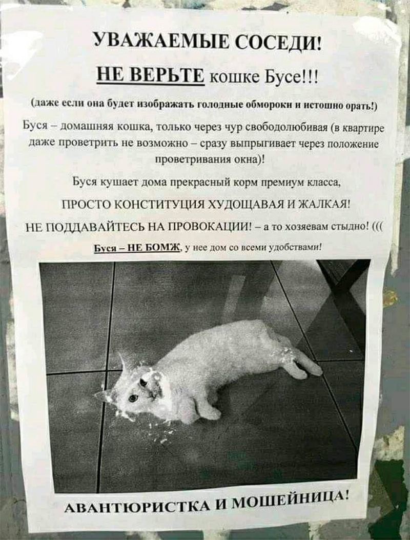 Кот Бублик пытался наложить вето на публикацию этого объявления (довольно безграмотного, да), с наложением вето ничего не получилось, поэтому он отвел душу, осквернив вместо этого тапки.