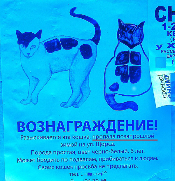 С женой снимали квартирку. Подарил ей котенка, красивого такого - пепельный весь, с закосом под породу... Выводили его гулять - вынесем во двор, поотирается немного - и домой. А один раз убежал, зараза. На следующее утро напчатал объявлений - так и так, пропал котенок, описание там, ну и 50 грн предложил нашедшему. Это где-то 5 бутылок водки на то время)) Ну и адрес квартиры указал - мобильные-то были, но дорогие насколько, что ой-йо-йой)). Супруга на то время не работала, сидела дома, а я ушел на работу. Прихожу вечером - рассказывает. Звонок в дверь. Открывает - там бомжики с двумя сумками.