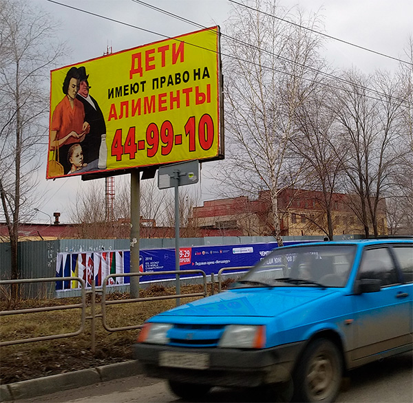Павел прислал социальную рекламу с Урала. Деньги на рекламу выделили, что-то там накалякали, водрузили. Дети имеют право на алименты. И телефон. Звонишь по телефону, говоришь, что бывший муж не платит алименты. "Обращайтесь в суд", - отвечает тебе суровый голос. Отличный социальный проект, я считаю.