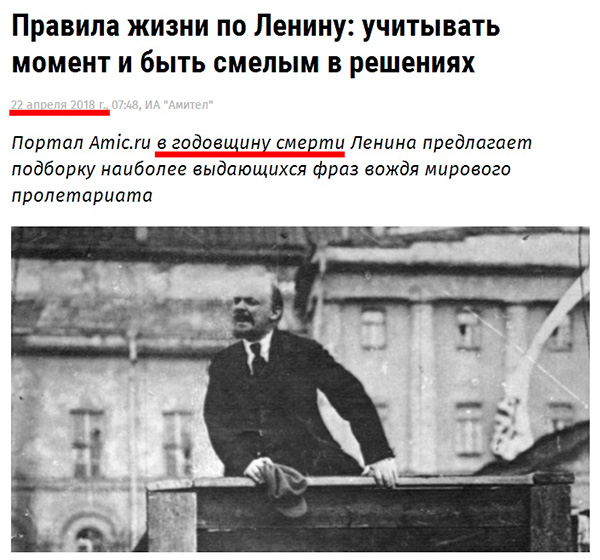 Не очень понятно, замечает RZ, то ли родился, то ли умер. Но что-то там такое точно произошло. Хотя правила жизни по Ленину, конечно, лучше цитировать именно в день смерти, потому что самый человечный человечек постоянно требовал расстреливать людей пачками без суда и следствия.