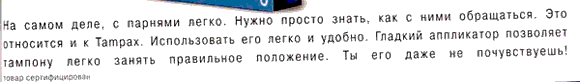Во-во! Тампаксы - они ведь как мужики! Нужно просто знать, как с ним обращаться! Знать, так сказать, куда его можно пускать, а куда нет!