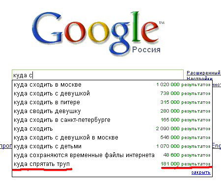 Также интересен тот факт, что "куда сходить в Москве" интересует народ всего в пять раз чаще, чем "куда спрятать труп".