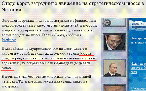 Правда, не очень понятно, почему, вместо того чтобы отогнать это стадо на безопасное место и дать по голове пастуху или владельцу, дорожная полиция выступает с предостережениями по радио и телевидению. Впрочем, может, им так проще. Тогда надо сделать двести плакатов и расставить их по всему шоссе Таллин - Тарту.