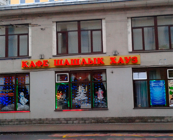 Вот тут грамотеи из той же серии, рассказал Геннадий. А ведь сколько еще красивых вариантов, например "Ресторан Плов Пэлас". Или "Рюмочная Бастурма Ритц". Или "Блинная Люля Хона".