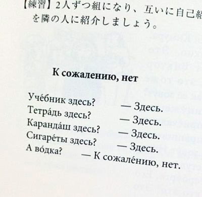 Китайский там вообще не при чем. Это японский, и вполне типичный учебник русского для японцев. Кстати, хорошо об"ясняет использование выражения "к сожалению". Ну и посмеются ученики, заодно 😉