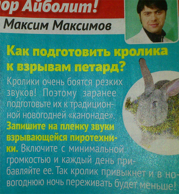 Сергей настоятельно рекомендует обратить внимание на советы этого прекрасного человека. Чтобы кролик не боялся петард, советует Максим, надо у него над ухом каждый день взрывать петарды на протяжении года. Тогда в Новый год кролик будет значительно меньше переживать - он просто привыкнет.