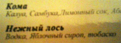 Ну, кома - это еще туда-сюда. А вот водка с яблочным сиропом и тобаско - это уже не "Нежный лось", а "Яростная белка".