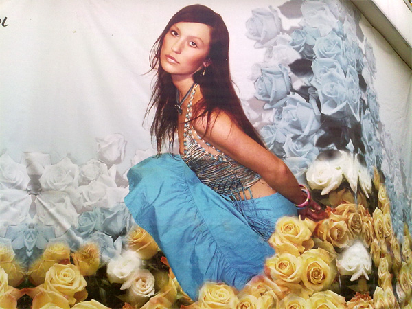 Еще один пример креатиффа, рекомендует Дмитрий. Это салон цветов. Почему тетя там присела "до ветру" - непонятно. Тем более что как раз в 15 метрах от плаката - общественный туалет, могла бы и добежать.