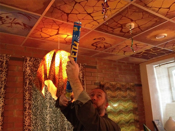 Хлопушка, правда, похоже, пневматическая. Но тыкать ей в подвесной потолок — надо додуматься. Смешной альтернативно одарённый чувак, да.