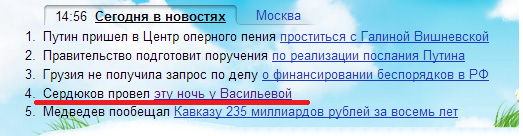 Имхо в новостях про Сердюкова акцент сделан не на самой интересной записи. Первая новость - "Путин пришел бла-бла-бла". Пробки? Не боится пешком по городу ходить?