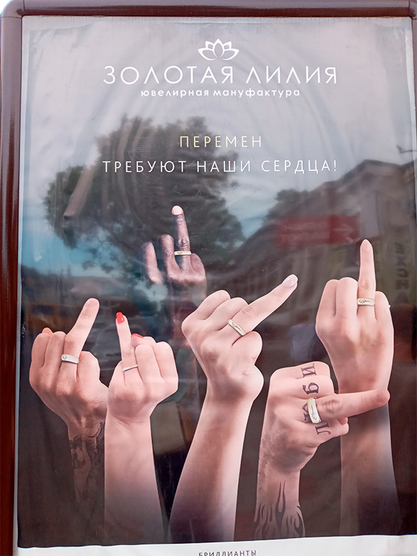 Поначалу кажется, что с плаката нам показывают "фак". Но, приглядевшись, мы понимаем, что все они оттопыривают безымянный палец, а не средний. А это что означает? Очевидно, это означает требование надеть колечко. Почему перемен требуют их сердца? Да потому что девушке замуж хоцца, вот вам и перемены. А рука на заднем фоне напоминает нам о том, что BLM!