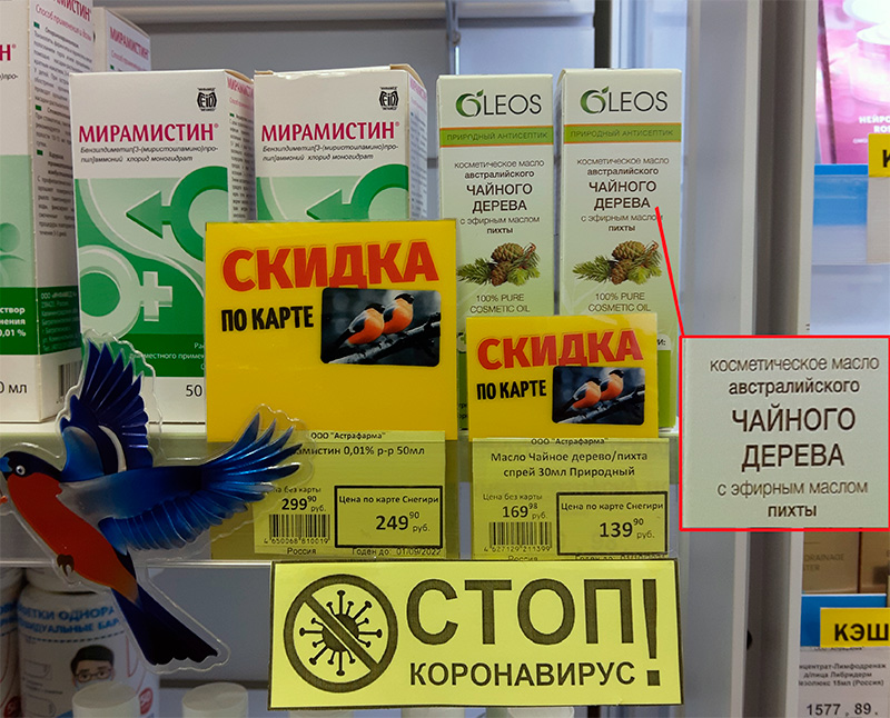 В этой аптеке, рассказал Моисей Абрамович, предлагают остановить коронавирус косметическим маслом австралийского чайного дерева. И еще мирамистином.