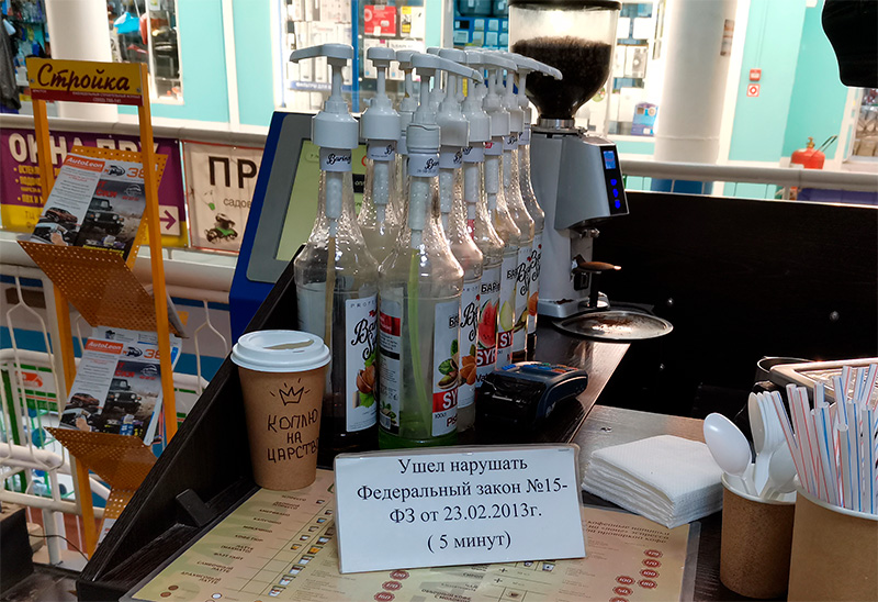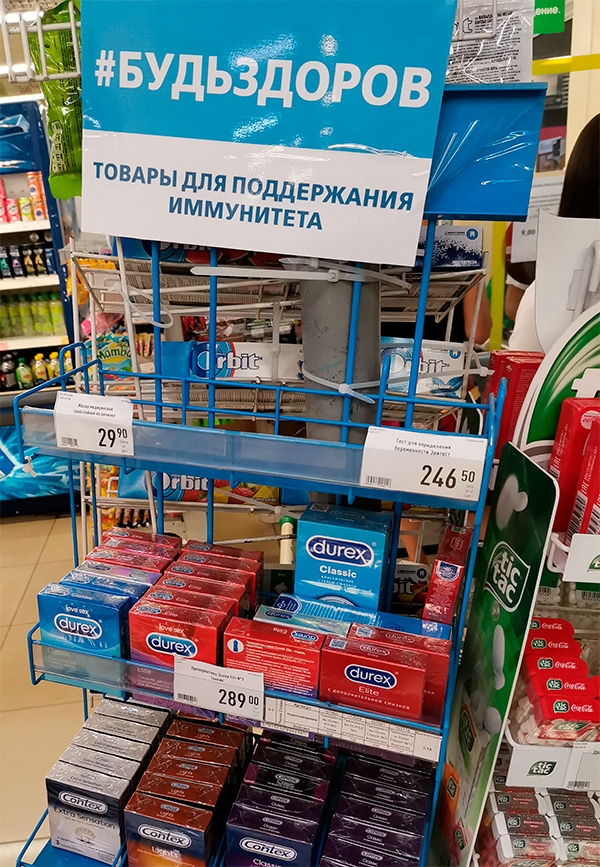 2) Надпись "СТОП! КОРОНАВИРУС!" не относится к тому, что на витрине. Ниже наверняка есть что-то про соблюдение социальной дистанции в очереди, но на снимок это не попало.