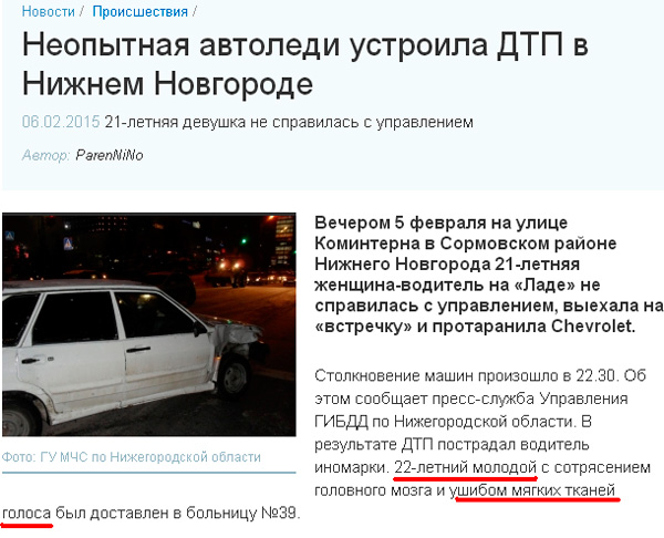 Aeternum восхищается новостником NN.ru. Ну, к его "автоледЯм" все уже привыкли, "22-летний молодой" тоже не проймет, но "ушиб мягких тканей голоса" - это уже парень просто жжот!