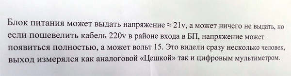 А это официальное заключение из сервисного центра по поводу блока питания. Оно гласит, что блок питания в принципе исправен.