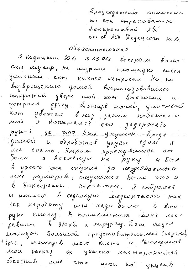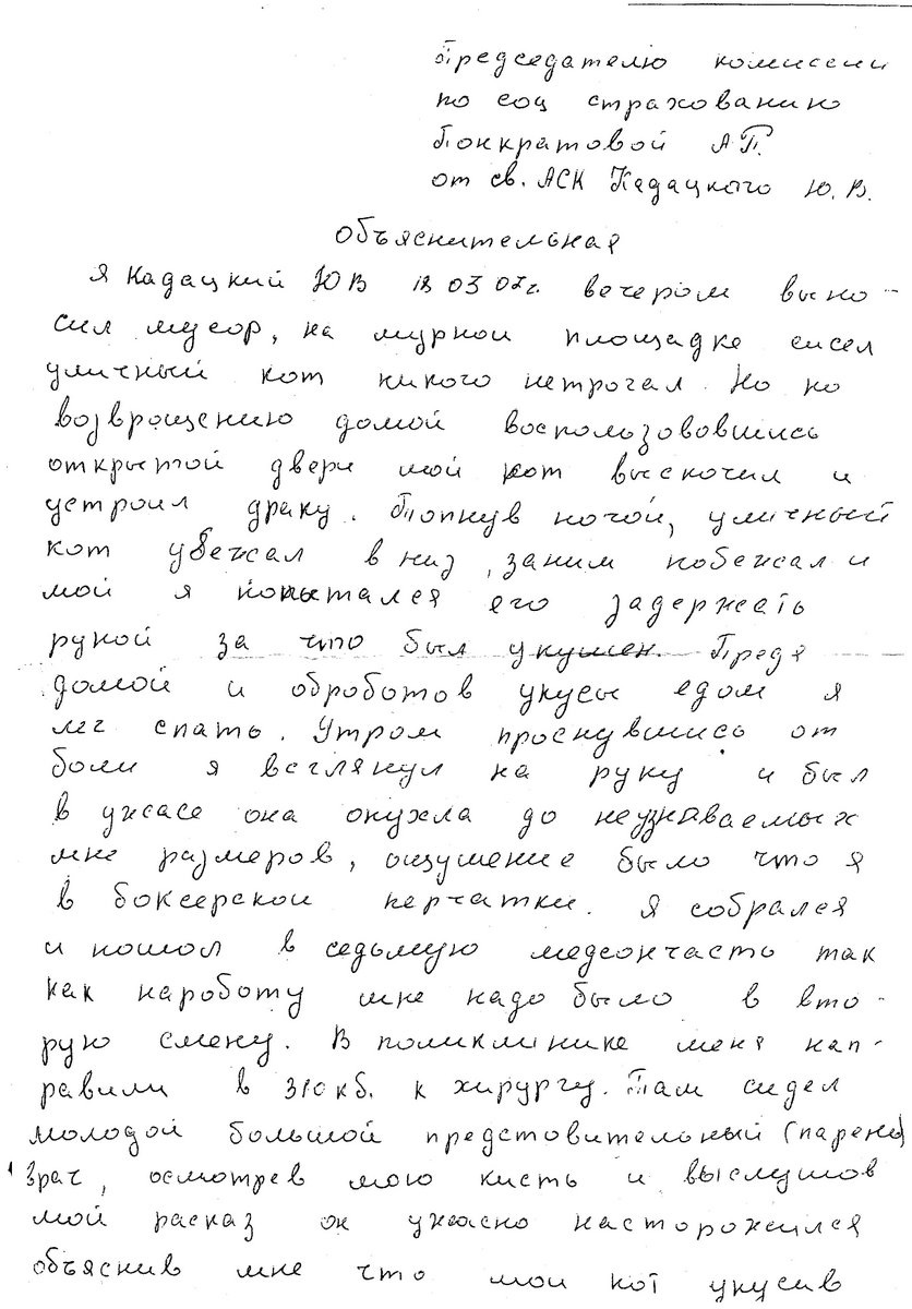 Анатолий прислал чудесную объяснительную о потере трудоспособности (кликабельно). Кот Бублик был в восторге. Особенно от пассажа: "Топнув ногой, уличный кот убежал в низ".