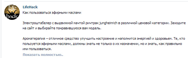 Какое счастье, радуется Игорь, что есть такое понятие, как Lifehack. Все-то они расскажут и подскажут. Например, кто же знал, что эфирные масла можно потреблять только с помощью электроштабелера, который товары по полкам склада расставляет? Видать, штабелер поднимает вас к бидону с маслами, а они вас и наполняют энергией и здоровьем. Ведь кто пользуется эфирными маслами - должен правильно знать, как правильно ими правильно пользоваться, правильно?