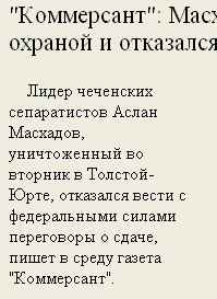 Даже уже уничтоженный Масхадов, удивляется Алексей, все-таки отказался вести переговоры с федералами. Сепаратист - он и уничтоженный остается сепаратистом!