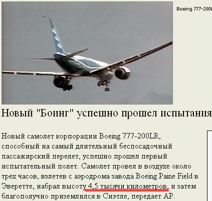 Да-да, набрал высоту в 4,5 тысячи километров, а затем, треснувшись об Луну, благополучно приземлился в Сиэтле. Классный самолет, просто новый светлый взлет науки и техники!