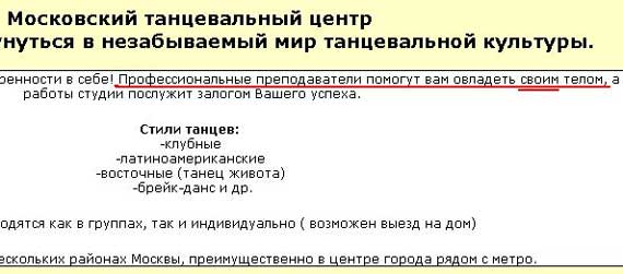 Забавно, да? Любой половозрелый четырнадцатилетний гражданин уже умеет овладевать своим телом в любой момент. Зачем для этого ходить в танцевальный центр, и что ТАКОГО могут показать профессиональные преподаватели - совершенно не понятно. Впрочем, индивидуальный выезд на дом - это интересно...