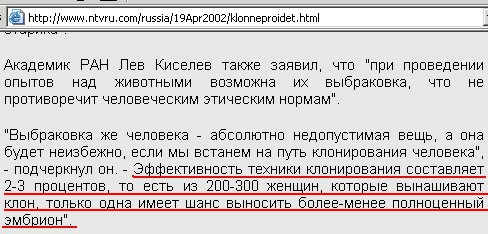 Прям как в том анекдоте: покупаю за тыщу, продаю за три - вот на эти два процента и живу. Хохма в том, что если эффективность 3 процента - то это из 300 женщин только девять имеют шанс выносить более-менее полноценный эмбрион, а не одна. Мы уж молчим, что фраза "эффективность... составляет 2-3 процентОВ" - просто неграмотна. Но оставим это на совести журналистов. Вряд ли академик настолько неграмотен...