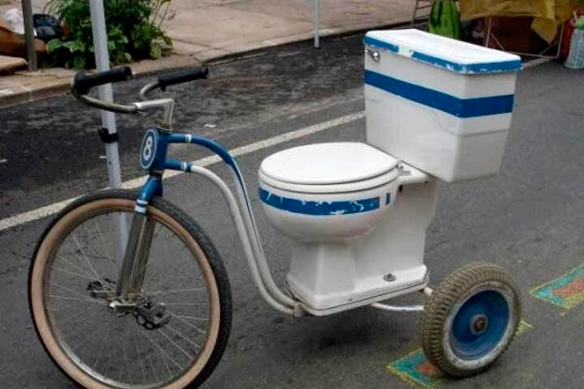 если в бачок унитаза вставить батарею, а в унитаз мотор, то можно сделать такой электро-трайк.