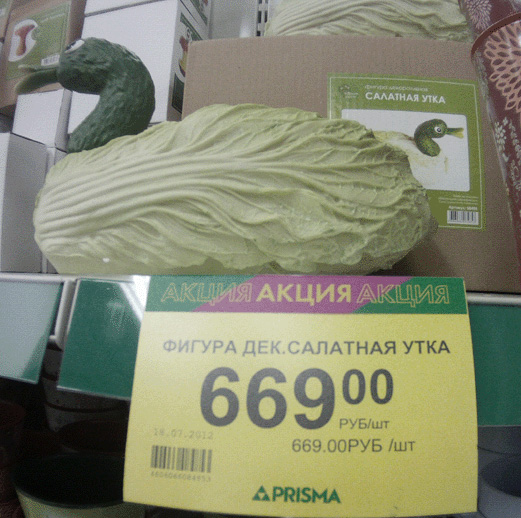 Александр долго думал над тем, что такое салатная утка. И тут два варианта, считаем мы с котом Бубликом. Или это утка для испорченного салата - в смысле, понадобится, если вы вдруг купите испорченный салат. Или же это салатная утка в том смысле, что вместо салата - одна увядшая картофелина.