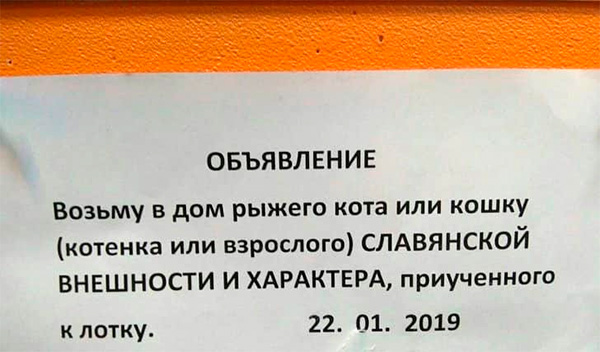 Михаил прислал объявление, которое немедленно получило приз зрительских симпатий кота Бублика, чей славянский характер хорошо приучен к лотку.