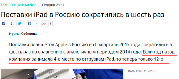 Пичалька, вздыхает Алексей. Если еще год назад компания Apple занимала 4-е место по отгрузкам iPad, то теперь только 12-е. А предыдущие 11 мест по отгрузкам iPad в Россию, видимо, занимает Samsung.