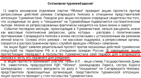 Московское отделение "Яблоко" проводит митинг против этого напыщенного и совершенно съехавшего на почве мании собственного величия мелкого тиранчика Туркменбаши. Однако "Яблоко" не зря именуется "политической партией". Кусание за задницу этого Туркменбаши должно сопровождаться лизанием все той же задницы. Это стиль работы политических партий. Это и есть - высокая политика. В заметке все написано совершенно четко: