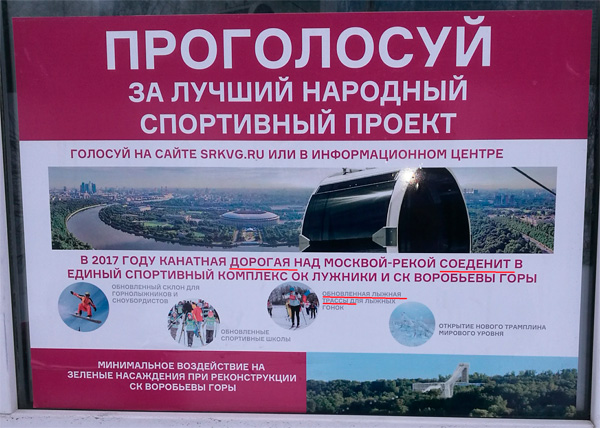 Этот плакат стоит на Воробьевых горах в Москве, вздыхает Алексей. Что канатка будет дико дорогая и на ней попилят все что можно - уже хорошо заметно по плакату.