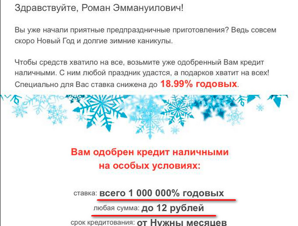 Роману от "Альфа-банка" в почте пришло вот такое чудесное предложение. Процентик высоковат, конечно, зато сумма не особенно крупная. Возьмет 12 рублей, через год отдаст 120 012 - нормально. Тут главное - нужны месяцев определить.
