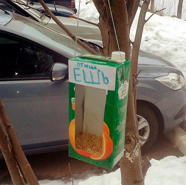 Приятно, замечает Михаил, что люди заботятся о птицах. Вот так летит птица мимо и не понимает, что это - ей. А надпись прочитает - ну, сразу все понятно. Хочешь, птица, ешь, а хочешь, птица, жуй.