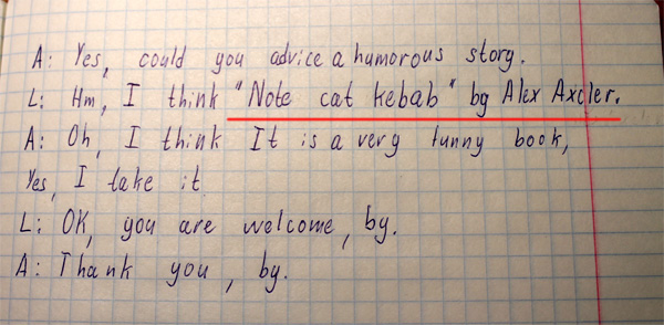 Ольга прислала страничку с диалогом, который дети должны были сочинить на уроке английского. Книжку там прикольную советуют...