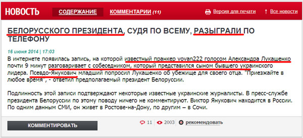 То есть пранкер вован222 голосом Лукашенко почти девять минут разговаривал с пранкером колян333, говорящим голосом сына Яныка. И все это под заголовком "Белорусского президента разыграли". Тут скорее "Эхо" разыграли, как мне кажется.