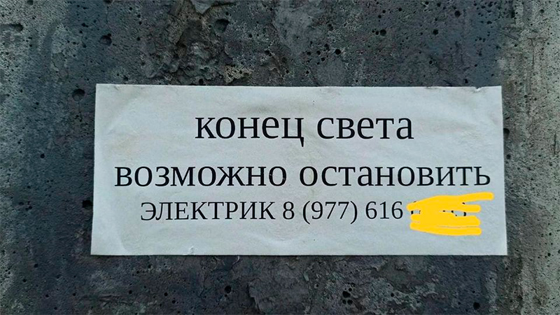 Довольно часто электриков вызывают, когда конец света уже наступил. Если данный электрик в основном чинит проводку, он вправе рекламировать свои услуги в качестве Бога, ибо он даёт свет заново.