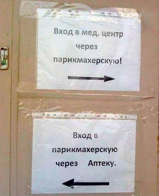 Ну то есть хочешь в медцентр - сначала в аптеку, потом в парикмахерскую. Кстати, а вход в аптеку - надеемся, через Алкомаркет?