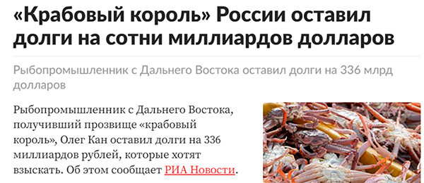 Лента.ру, рассказал Yerzhan, перепечатывает новости из РИА не приходя в сознание. Долги у крабового короля всё-таки в рублях, о чем легко догадаться.