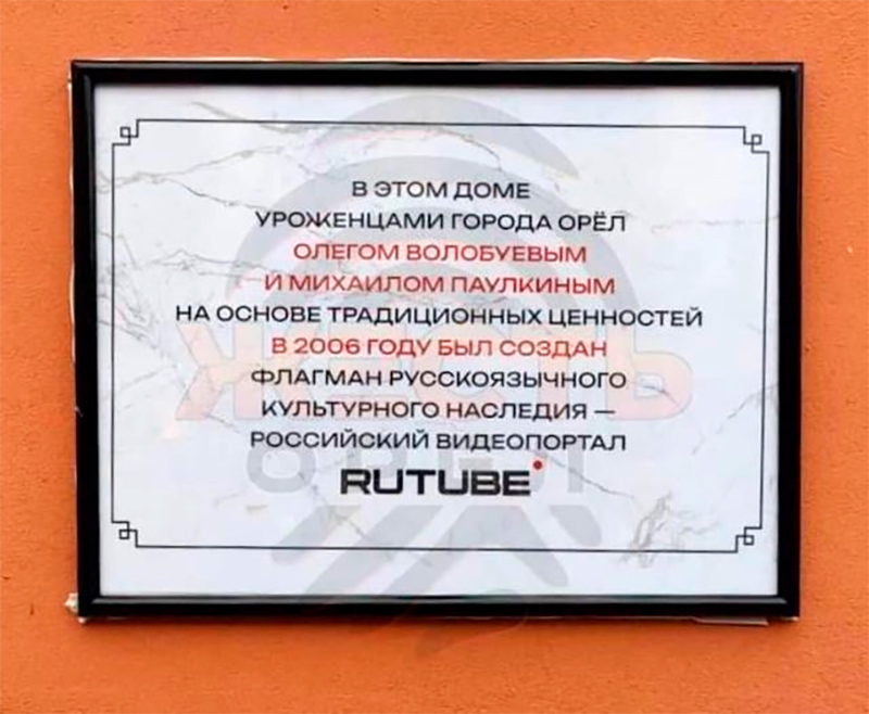 Повесили вот такую памятную доску в городе Орле, вздыхает Олег. То есть они реально гордятся тем, что эти два пряника создали угробище под названием Rutube на основе "традиционных ценностей".
