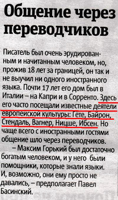 Байрон однозначно являлся в гости, соглашается Павел, прям вместе с Гёте, но - только после десятка косячков. Причем уж с Байроном и Гёте Горькому удавалось побеседовать и без переводчиков.
