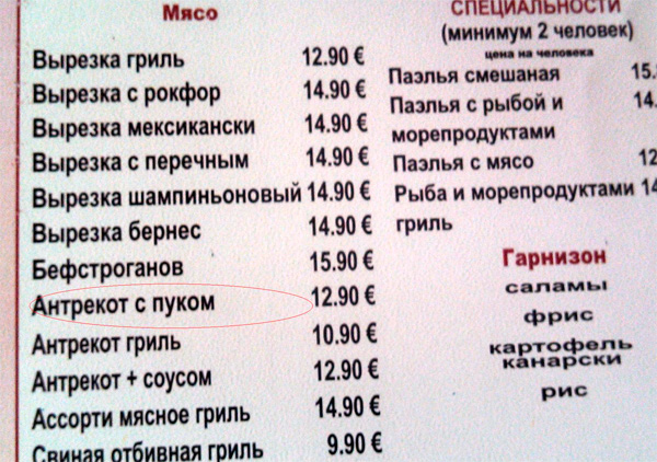 Вот такие антрекоты предлагают на "Тенерифе", грустит Алексей. Прям честно признаются, что антрекот - не слишком свежий. Впрочем, может, это просто такая форма подачи, оригинальная?!!