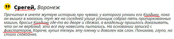 Хотелось бы уточнить, про какую пленку пишет Срегей из Воронежа. Тонировку? Полиэтилен, которым он теперь машину накрывает? Или пленку в свой регистратор? (простите, в фикстатор)